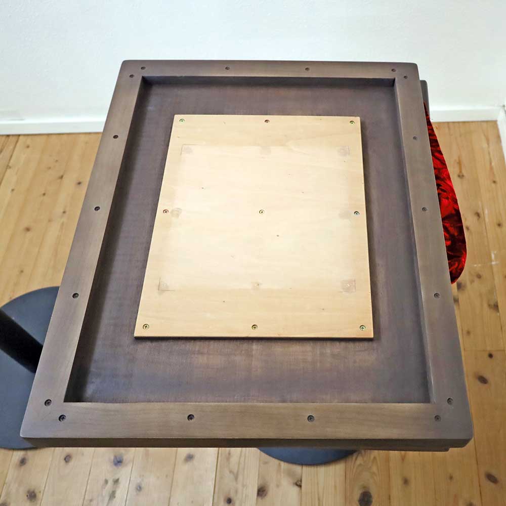 天板中央の色の薄いコンパネは、スチール脚との連結用です。