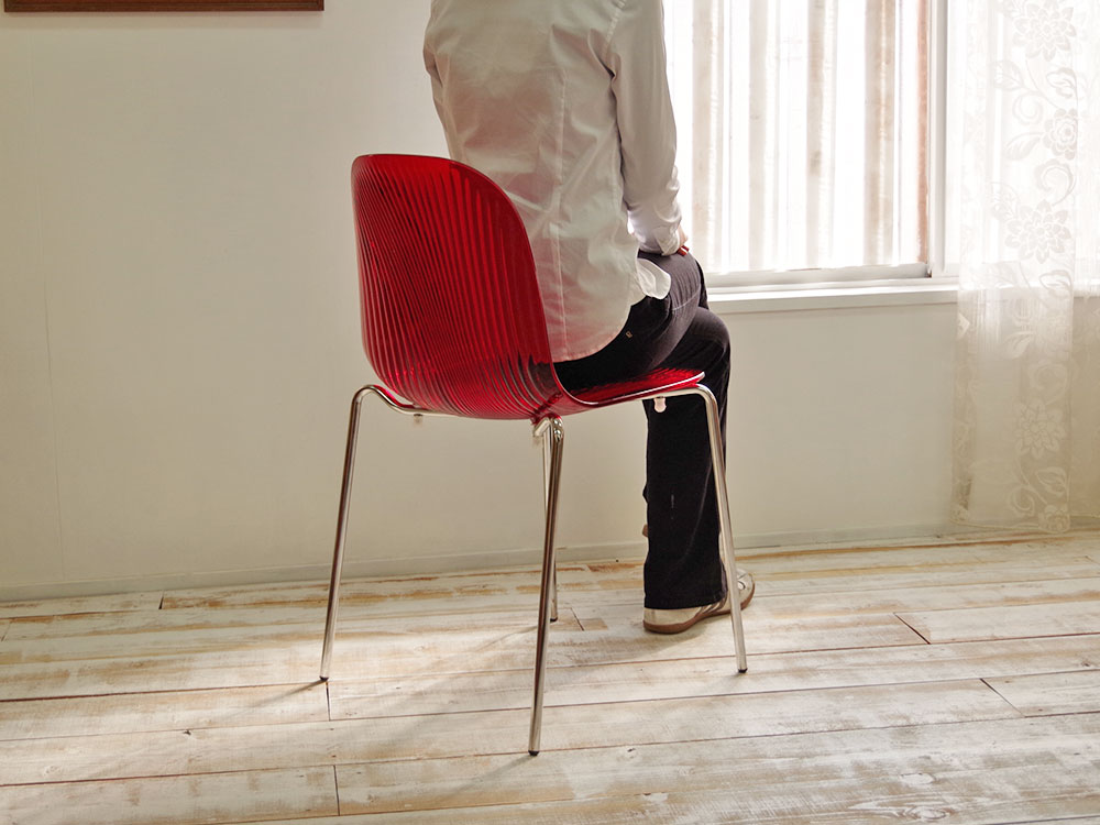 緩やかなRのついた形状の座面や背もたれで座り心地、キズが付きにくい樹脂製で座面は好評です♪