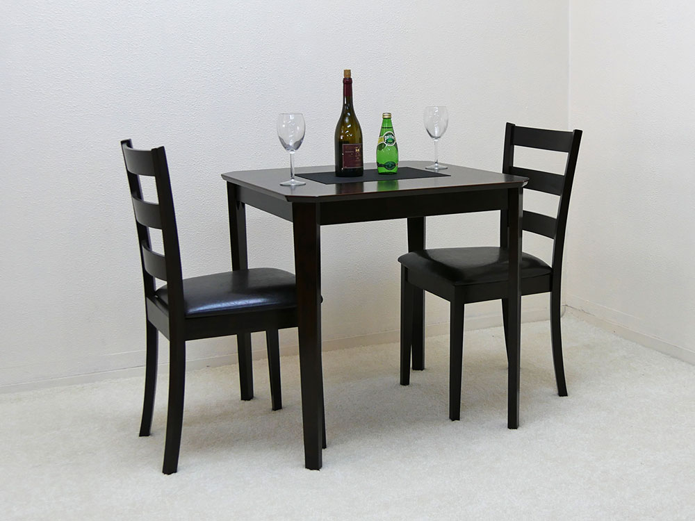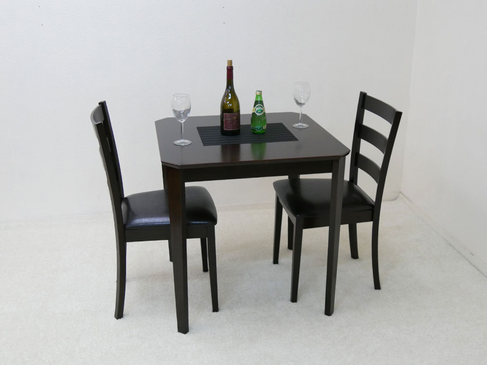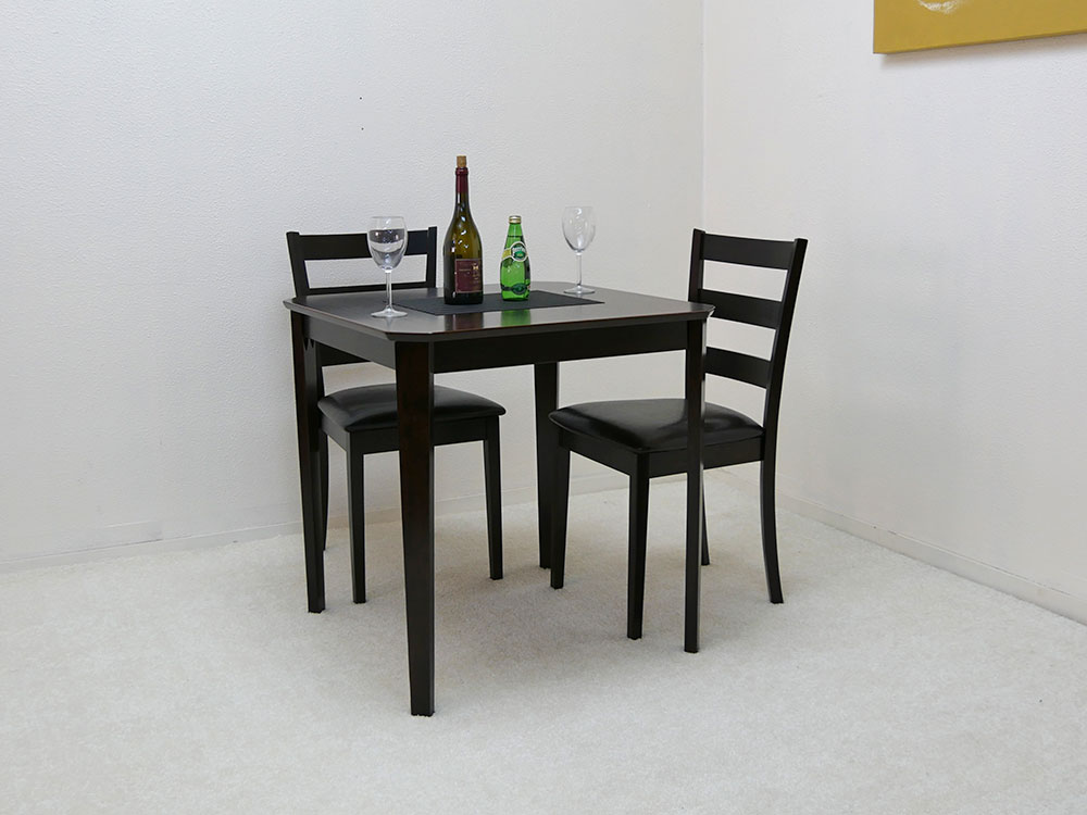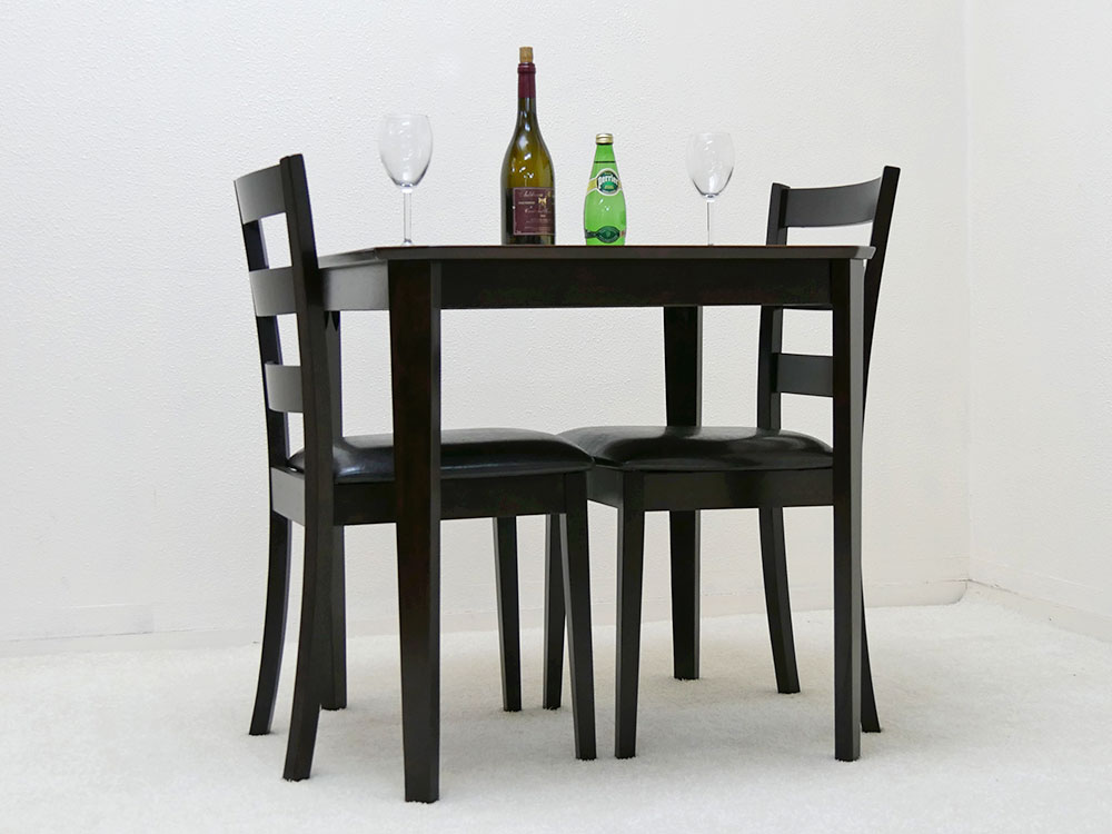 75cm角のコンパクトなテーブル。こげ茶色のシンプルでオシャレな雰囲気の木製テーブルセット。2人家族用のご家庭用ダイニングテーブルとしても。